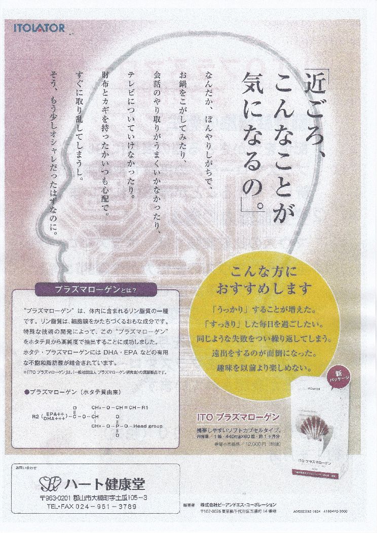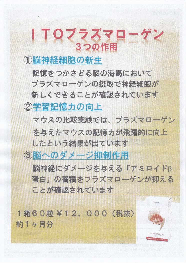 … | 脳疲労を改善するという自然物質。 認知症に新アプローチ。 ( 脳疲労は、メタボ、うつ病、糖尿病を引き起こすという学説があるが、、、 この脳疲労とプラズマローゲンに関する内容が、TBS『夢の扉+』で放送さました。)ITOプラズマローゲンのチラシ 表 |